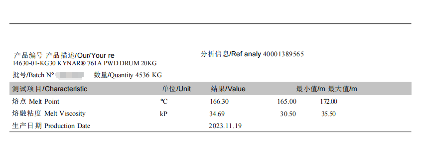 由上述:阿科玛 PVDF 761 :粘度为:30.5~36.5KP