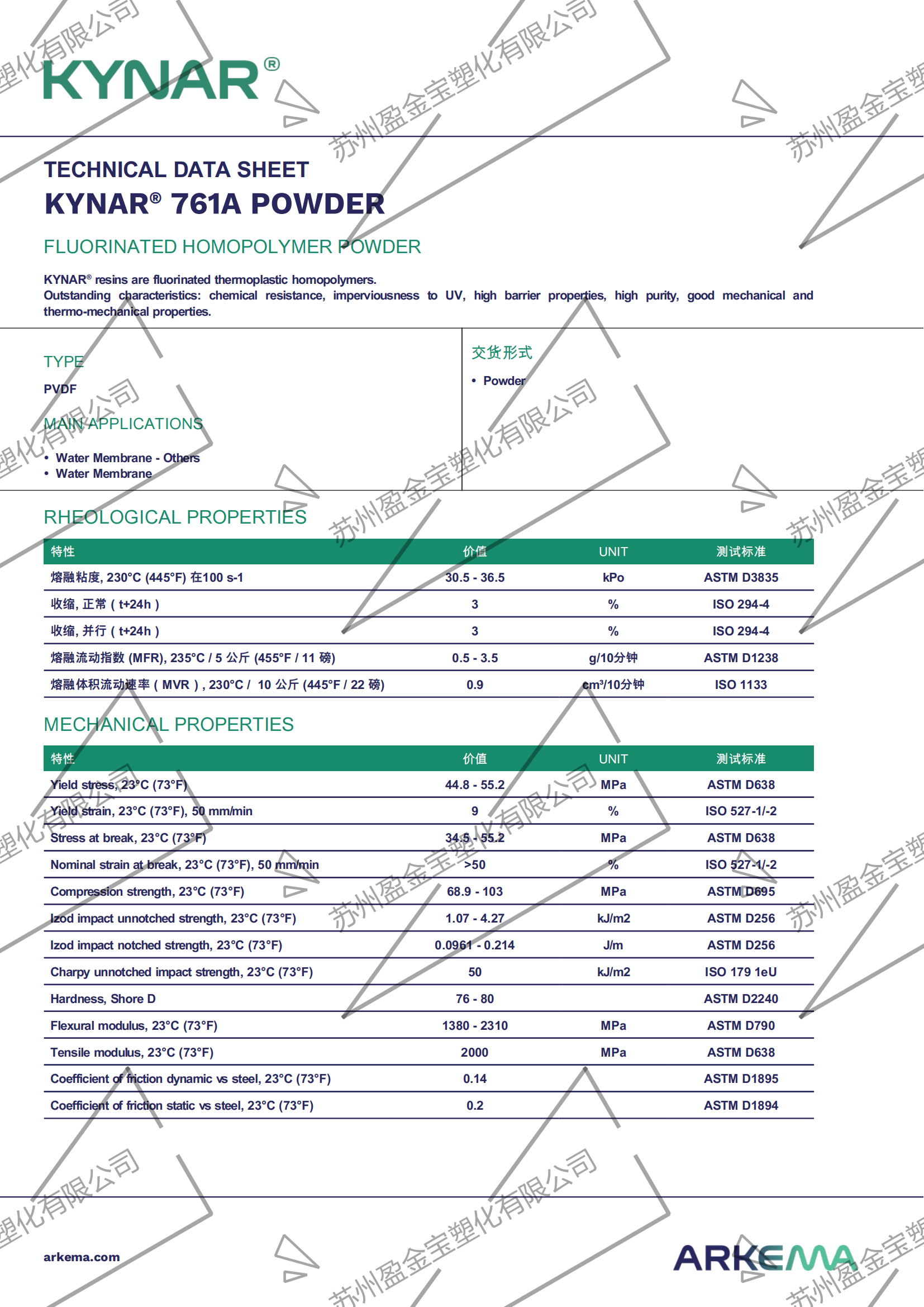 阿科玛PVDF761A粉末销售代理商:苏州盈金宝塑化有限公司